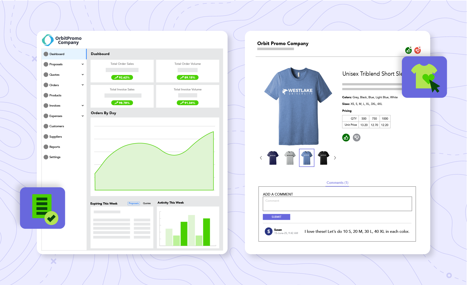 • Quick Customer Customizations: Wow customers without adding extra steps for your team with customer-level default settings, templates, and virtual mockups that show customers exactly what products look like with their logo.