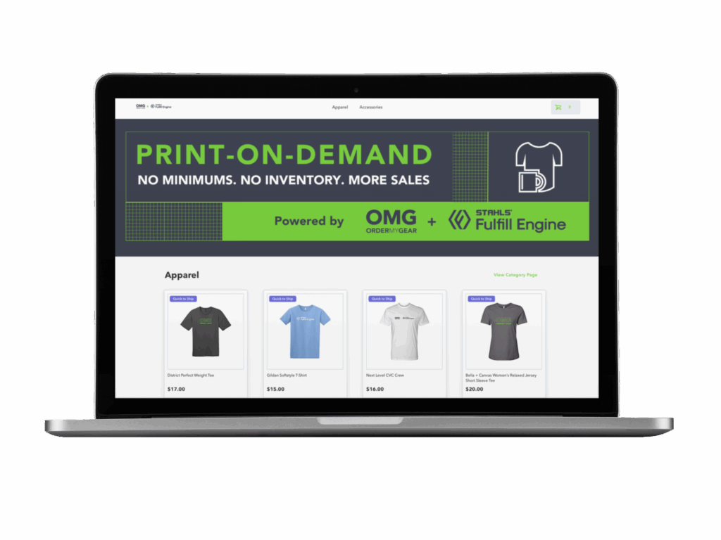To make this a reality for our clients, OMG and STAHLS’ Fulfill Engine have joined forces to offer print-on-demand stores. Promotional product distributors, apparel decorators, and team dealers can tap into a network of vetted decorators to automatically source, decorate, and ship products directly to consumers on their behalf.